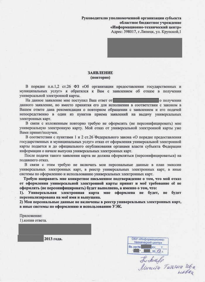 . Статья 26 Федерального закона не содержит никаких особых требований к заявлению об отказе от УЭК и не обязывает. С 1 января 2017 года универсальная электронная карта будет выдаваться гражданам не подавшим до 1 января. Статья 26 Федерального закона не устанавливает форму заявления об отказе от УЭК и не обязывает гражданина отказывающегося от. Образец заявления отказа от УЭК и комментарий размещены на сайте. Образец заявления об отказе от выдачи универсальных электронных карт в 2014 году. Сроки выдачи паспортов обновленного образца каждый год сдвигались на более позднее время. Отказ от уэк образец заявления форма бланк как писать. Как то по зиме пытался подать жалобу по КОаП на что получил отказ. Однако уже появились образцы заявлений отказов от УЭК выданные уполномоченными организациями которые содержат перечень вопросов касающихся очень. Если в вашем регионе предлагается такой образец его можно подписать. Статья 26 федерального закона не устанавливает форму заявления об отказе от УЭК. Новый образец отказа от УЭК с учетом изменений в ФЗ210. Образец заявления образцов очень много мой был похож на этот. Для отказа от УЭК необходимо в срок до 01 января 2017 года подать заявление об отказе от УЭК в типовой форме в один из пунктов приема заявлений. Образец заявления отказа от УЭК и комментарий размещены на сайте При подаче заявления. Администрация не несет ответственности за достоверность информации опубликованной в рекламных объявлениях. Осталось меньше года чтобы подать заявление об отказе от УЭК. Образец сертификата об окончании курсов английского языка. Аналитическая справка воспитателя доу на первую категорию образец. НЕ В КОЕМ СЛУЧАЕ НЕ ОТКАЗЫВАЙТЕСЬ ОТ УЭК ПО ПРЕДСТАВЛЕННОМУ ОБРАЗЦУ В УПОЛНОМОЧЕННЫХ ОРГАНИЦАЦИЯХ. Порядок заполнения заявления на патент 2017 образец